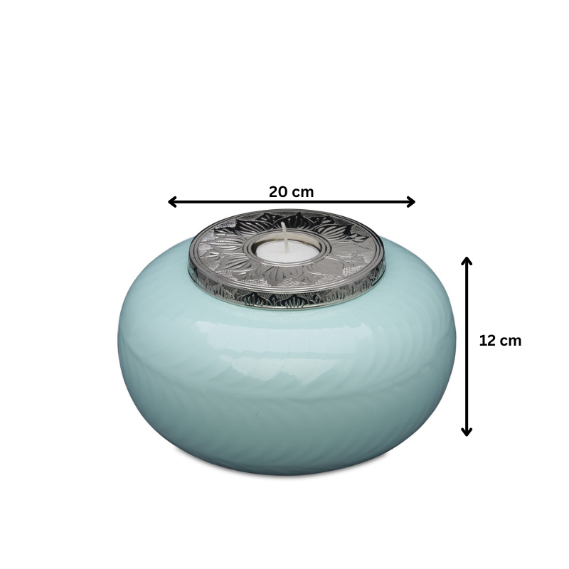 This stunning Baby Blue Candle Medium Urn is made from solid brass. The soft blue enamel coating has a natural soft hammer pattern running in circles around the body of the urn. The lid is made from silver nickel, features a beautiful mandala pattern and houses a tealight candle. This cremation urn requires no maintenance, is very well made and is heavy in weight.