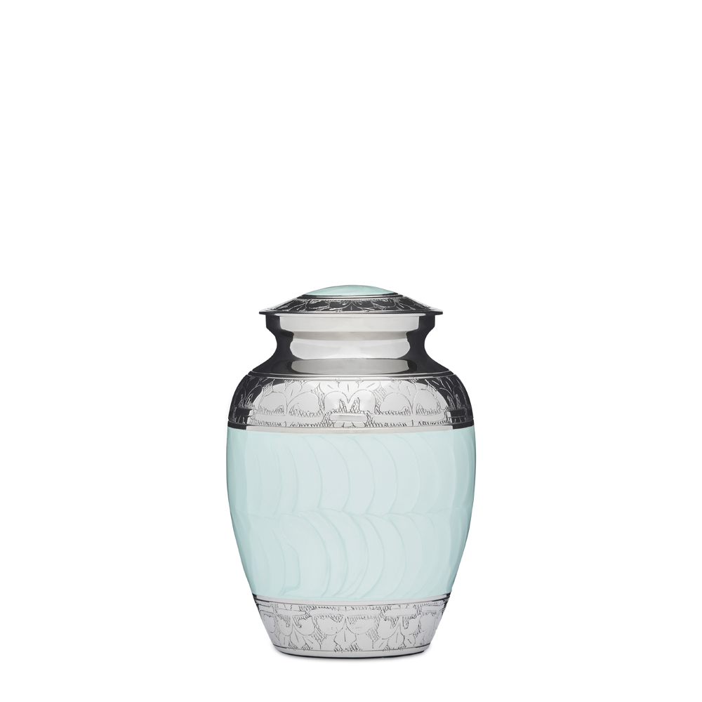 This beautiful blue enamel urn has a Fleur de Lis pattern embedded in the silver nickel plating. The blue enamel has a natural soft hammer pattern running in circles. This cremation urn is made from solid brass, requires no maintenance and is very well made and is heavy in weight.