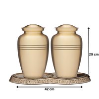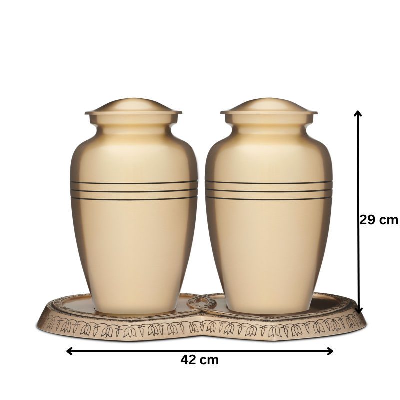 Two stunning brass urns with a gold look finish and a heart-shaped base. The Brass Double Urn is designed to hold two adults. Each urn has three black rings etched onto the upper body of the urn.  This cremation urn is made from solid brass and finished with a clear coat lacquer.  This urn requires no maintenance and is very well made and is heavy in weight.