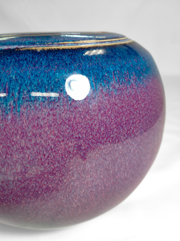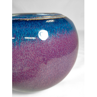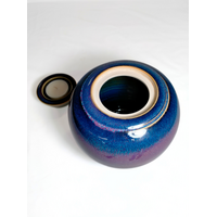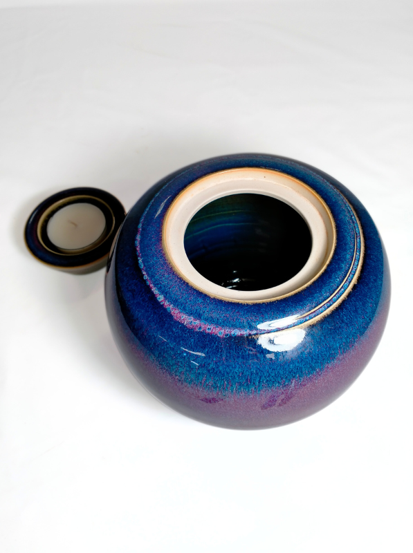 A beautiful ceramic candle urn hand-thrown by West Australian artist, Hayley Bangham of Conscious Clay. This urn is hand glazed in the Ether Element palette. Ether is a striking mixture of violet and midnight blue bound together with pools of cream, magenta and dusty pink. All the colours of our cosmos.