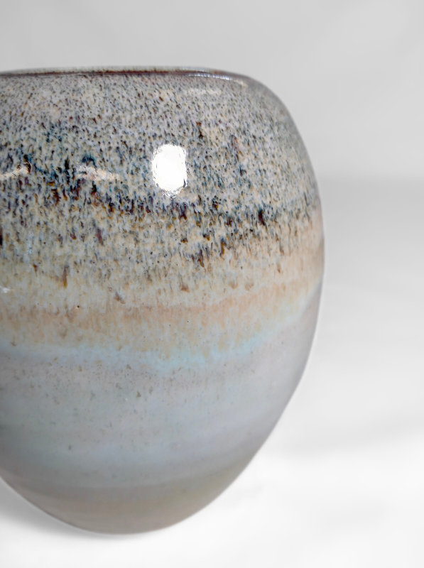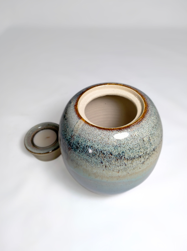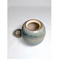 A beautiful ceramic candle urn hand-thrown by West Australian artist, Hayley Bangham of Conscious Clay. This urn is hand glazed in the Air Element palette. Air is a beautiful high gloss white base with touches of sky blue & strokes of light grey. It has subtle golden flashes throughout representing the sun's warming rays.