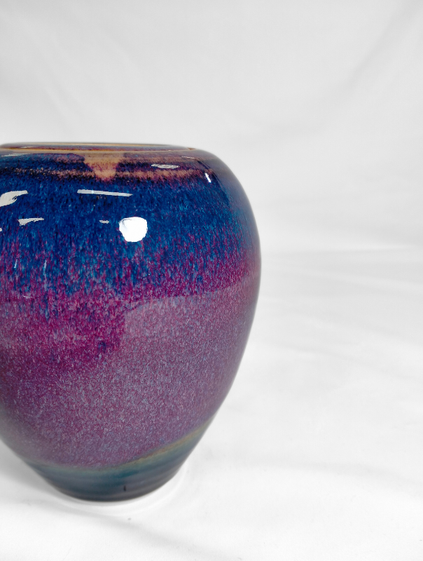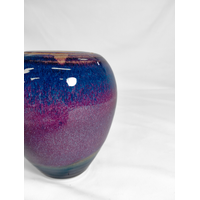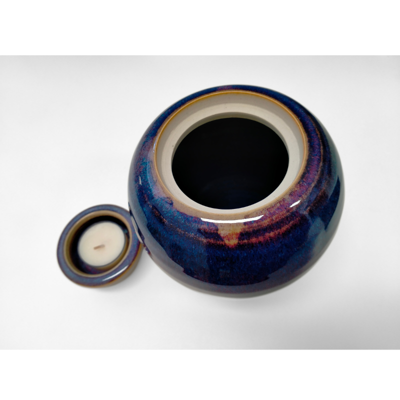 A beautiful ceramic candle urn hand-thrown by West Australian artist, Hayley Bangham of Conscious Clay. This urn is hand glazed in the Ether Element palette. Ether is a striking mixture of violet and midnight blue bound together with pools of cream, magenta and dusty pink. All the colours of our cosmos.