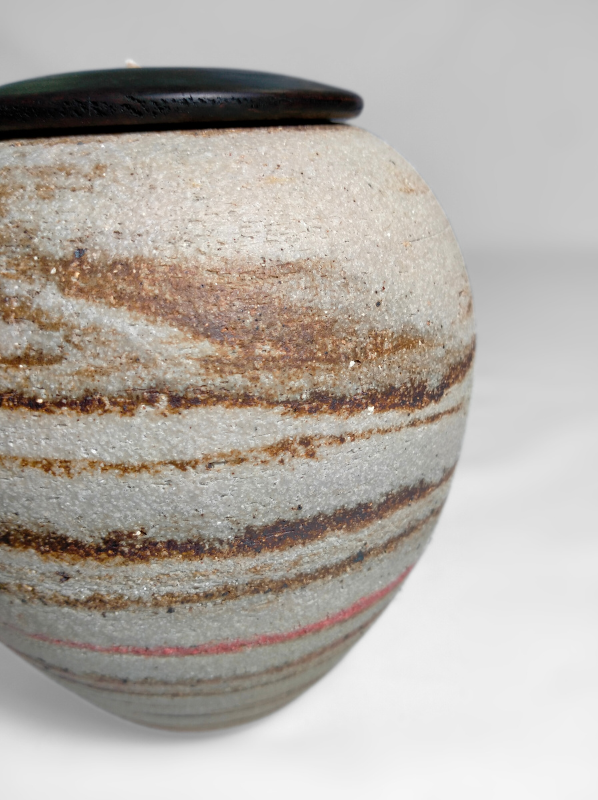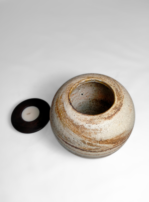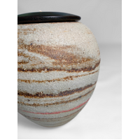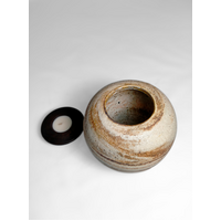 A beautiful ceramic candle urn hand-thrown by West Australian artist, Hayley Bangham of Conscious Clay. This urn is created using the Japanese Neriage technique (pronounced Nair-ee-ah-gee). It involves layering and stacking various colours and grades of clay by hand. When thrown, this 'composite' produces a captivating and unique blend of swirls and spirals. Each piece has several different colours and grades of Australian sourced clay, including fine white porcelain, buff raku trachyte, warm tanned and creamy coloured ironstones, rough bark chocolate stoneware and slithers of pink clay. The exterior is burnished with river stone while it is leather hard, emphasising the natural colours and exposing the raw minerals embedded in the clay.