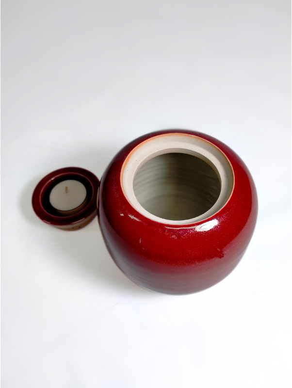 A beautiful ceramic candle urn hand-thrown by West Australian artist, Hayley Bangham of Conscious Clay. This urn is hand glazed in the Fire Element palette. Fire is a captivating traditional high gloss Chinese "OxBlood" glaze characterised by a deep rich burgundy red hue with purple and blue undertones. Its mottled appearance gives it a sense of depth, complexity and movement.