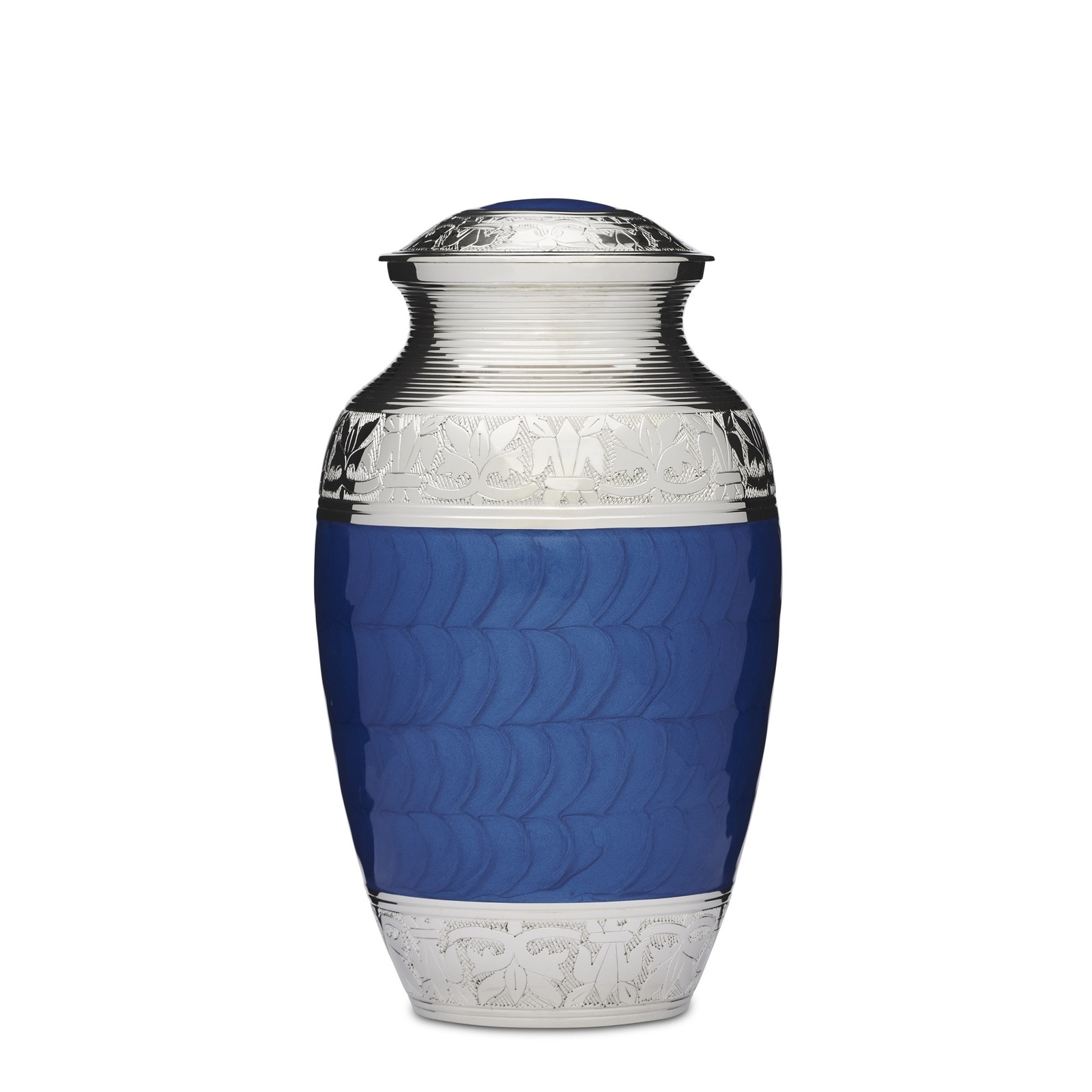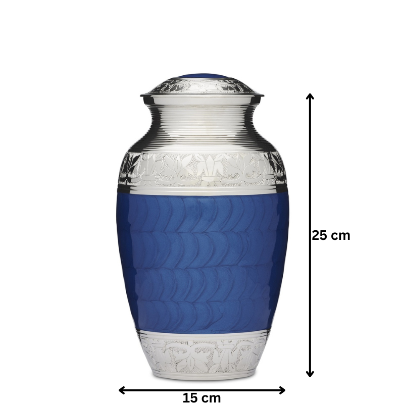 This beautiful vibrant blue enamel urn has a Fleur de Lis pattern embedded in the silver nickel plating. The blue enamel has a natural soft hammer pattern running in circles around the body of the urn. This cremation urn is made from solid brass, requires no maintenance and is very well made and is heavy in weight.