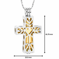This lovely cross pendant with beautiful heart detail encases a small cross-shaped vessel. This pendant is made from stainless steel and finished in silver and gold tones. A small recess in the inner cross enables you to enclose a few grains of your loved one's ashes.