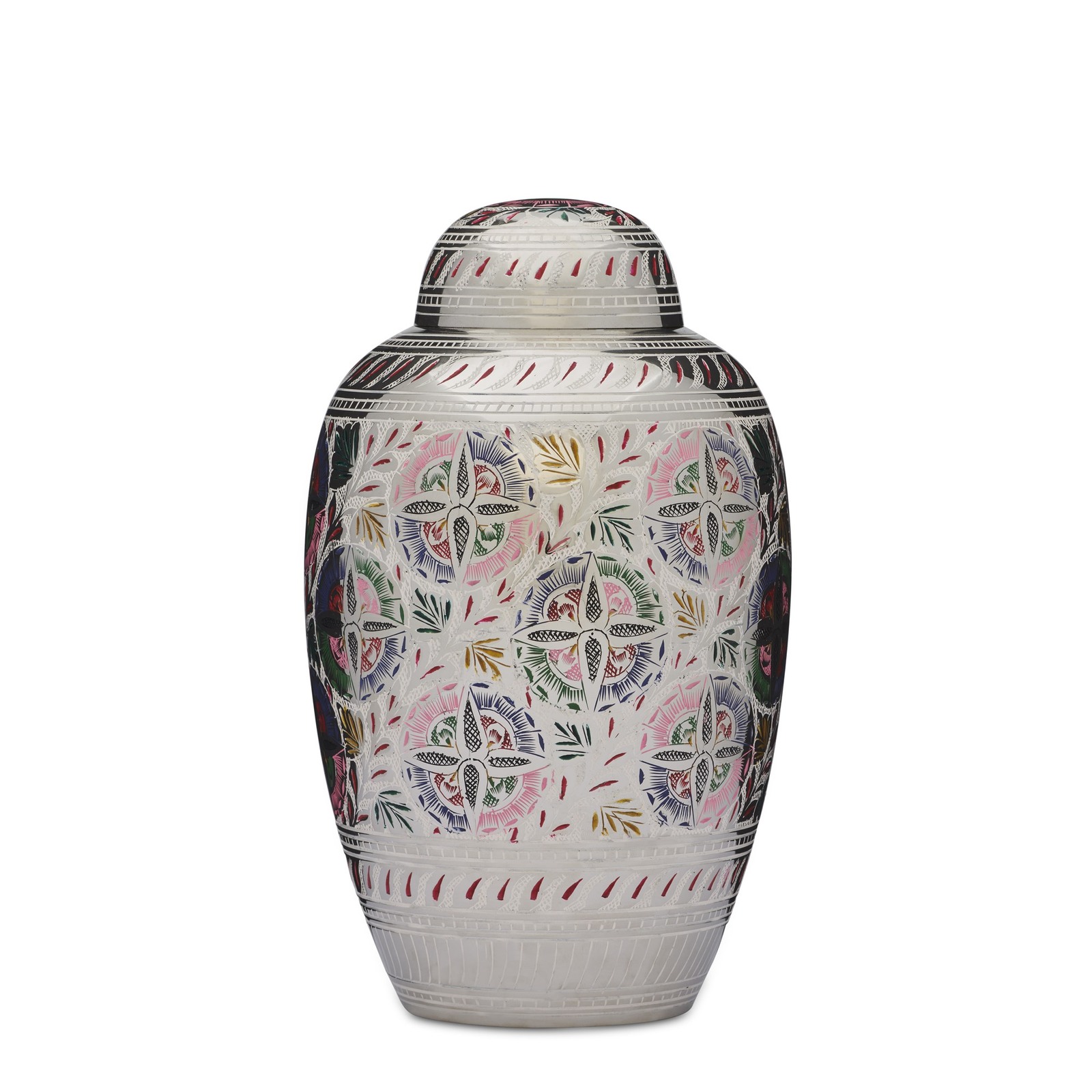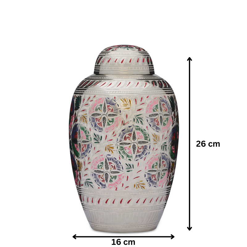 This multicolour Dometop Lattice Urn has an exquisite pattern in silver nickel over laying the brass base. This cremation urn is made from solid brass, requires no maintenance and is very well made and is heavy in weight.