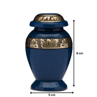 This stunning Embassy Blue Grey Urn Keepsake is perfect for keeping a small memento of your loved one - such as soil or sand from a special location, a lock of hair, dried flower petals, a special note, or a portion of cremation ashes. This elegant keepsake is made from solid brass, with a blue-grey enamel coat. The enamel has a faint black speck running through it. The gold-plated bands are embedded with an intricate leaf pattern.