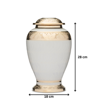 This stunning white enamel urn has gold brass plated rings engraved with an intricate leaf pattern. The white enamel coat has a natural soft hammer pattern running in circles around the urn. This cremation urn is made from solid brass, requires no maintenance, is very well made, and is heavy in weight.
