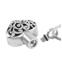 A lovely heart pendant with a beautiful filigree design and a contrasting black background. This solid pendant is made from stainless steel and finished in a silver tone. A small recess enables you to enclose a few grains of your loved one's ashes.