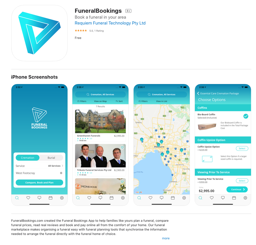 FuneralBookings.com reminds me of a combination of Airbnb and Uber eats but for funerals. The app designed for funeral directors allows them to create their own listing and receive in-app messages from families just like you. Families can control the price of the funeral but adding lots of flowers and making the coffin cheaper in the product selection section of the cart. Consumers these days expect to have pricing transparency and full control over customizing the details of the funeral. By using the Funeral Bookings app you don't need to feel any pressure and can make the decisions for the funeral sitting on your couch at home.