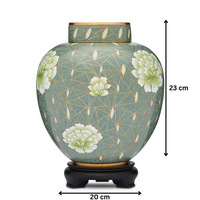 This beautiful solid brass urn is finished with a hand-painted Cloisonné technique. The Cloisonné technique is an ancient Chinese tradition, and to this day, are still made this way. The Cloisonné design is on a green base, featuring green and white flowers and a geometric pattern using metallic gold wire. This urn requires no maintenance, is very well made and heavy in weight.