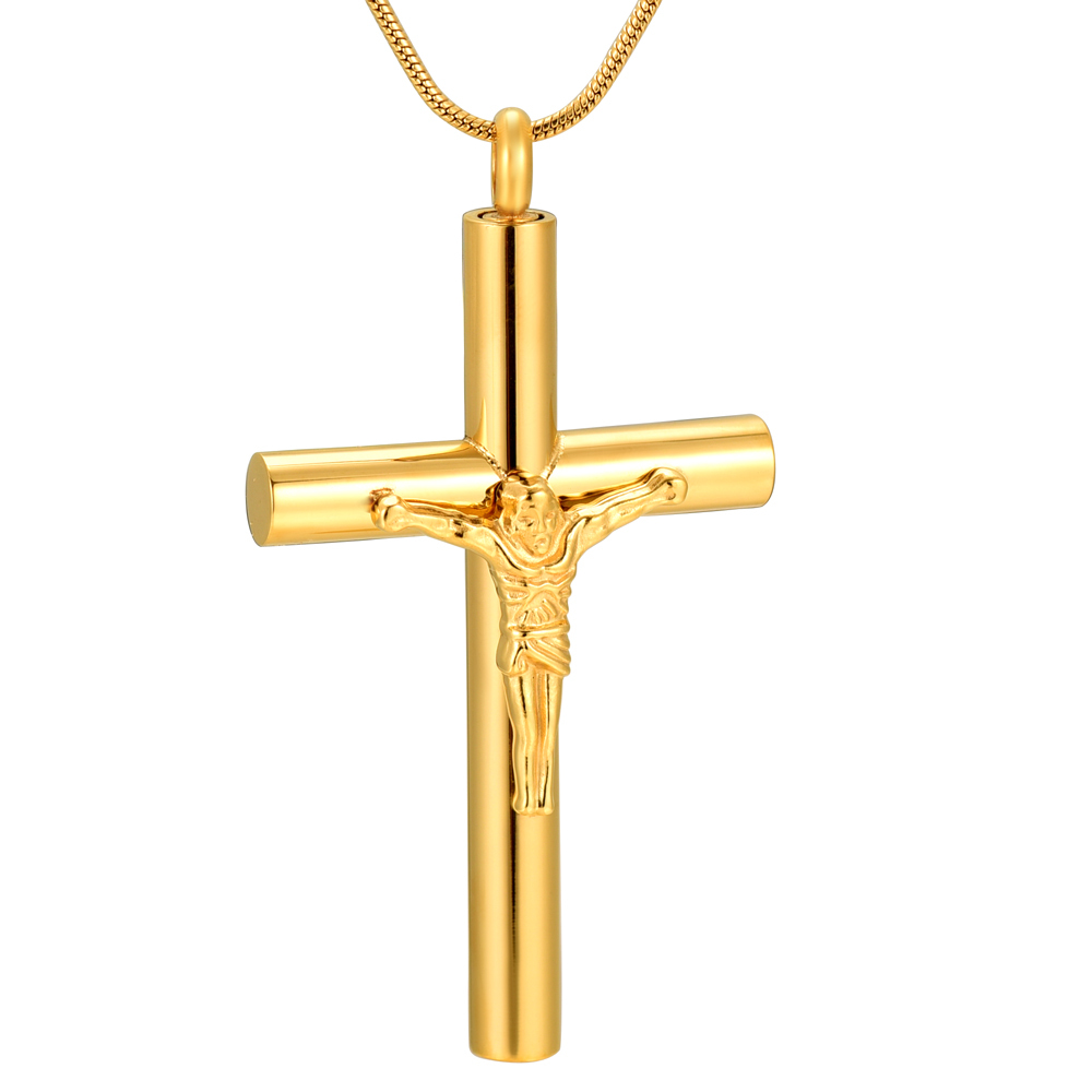 This versatile Jesus on a cross pendant could be worn as a necklace pendant or hung on the wall or around the neck of an urn. This solid pendant is made from stainless steel and finished in a gold tone. An internal cavity enables you to enclose a small amount of your loved one's ashes.