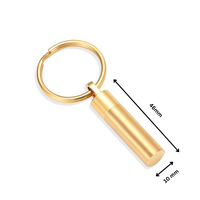 A black cylinder keychain with a matching key ring. This sleek keychain is made from stainless steel and finished in a gold tone. A small recess enables you to enclose a few grains of your loved one's ashes.