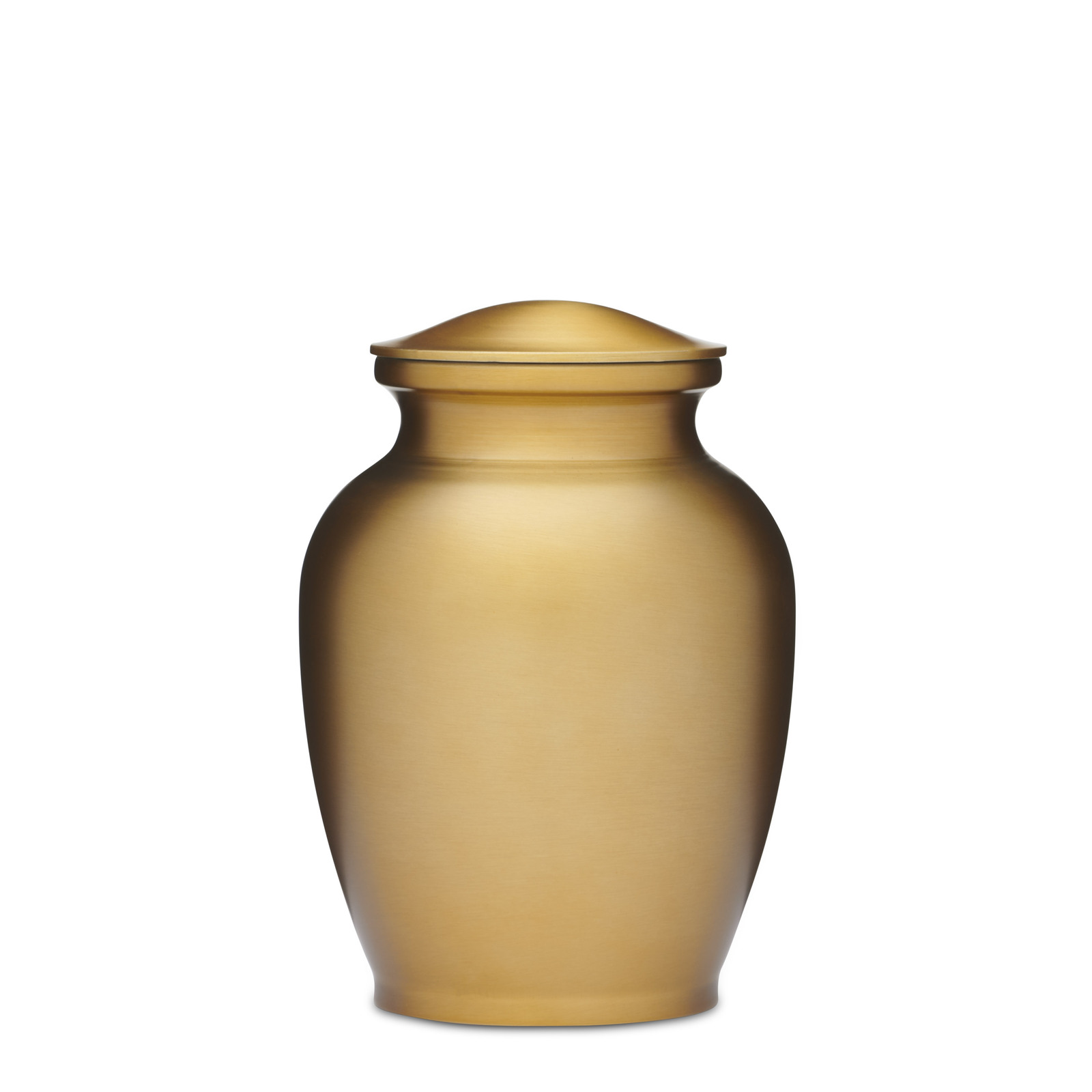 Our Gold Alloy is a strong, light weight cremation urn, coated with a gold coloured paint with a matte finish.  This cremation urn is made from strong alloy and requires no maintenance.