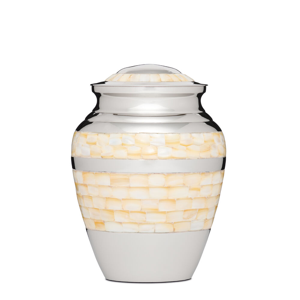 This handmade Mother of Pearl cremation urn is very well made and heavy in weight. Mother of Pearl tiles are inlaid on the body and lid. Banding of silver nickel plating on the body and neck of the urn.