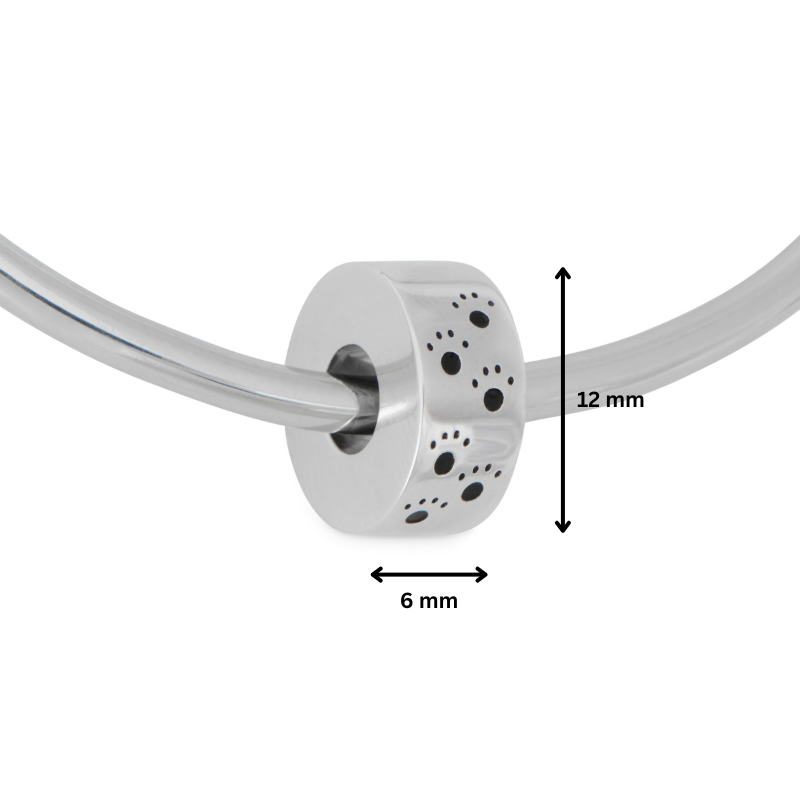 A lovely cremation bead engraved with paw prints. This bead is made from 925 silver and suits Pandora and other major brands of European-style charm bracelets. A small recess enables you to enclose a few grains of your beloved pet's ashes.
