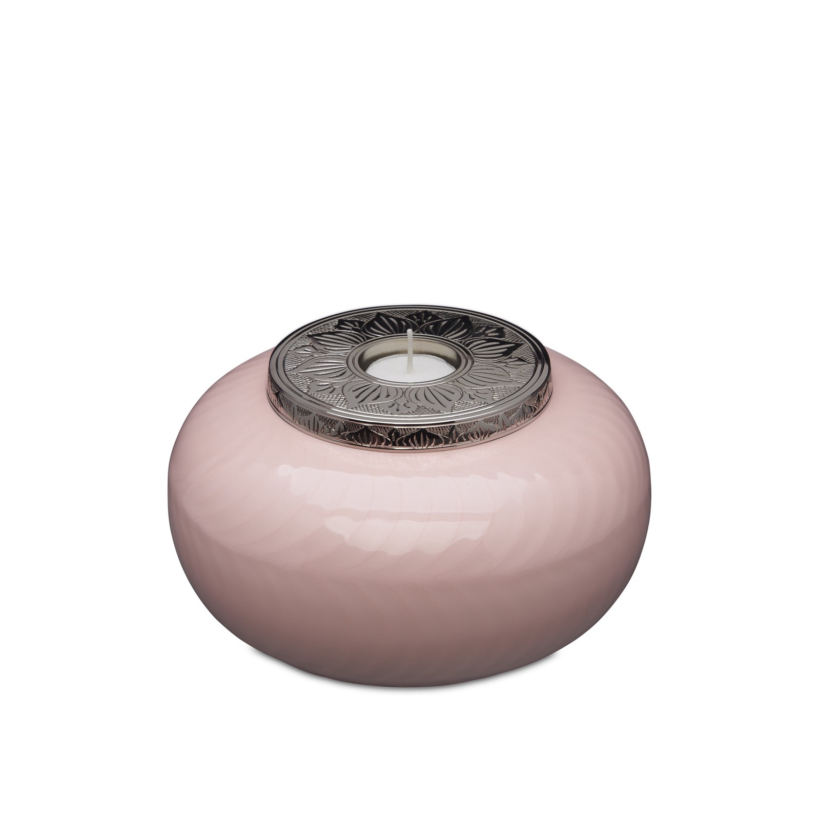 This stunning Pale Pink Candle Medium Urn is made from solid brass. The soft pink enamel coating has a natural soft hammer pattern running in circles around the body of the urn. The lid is made from silver nickel, features a beautiful mandala pattern and houses a tealight candle. This cremation urn requires no maintenance, is very well made and is heavy in weight.