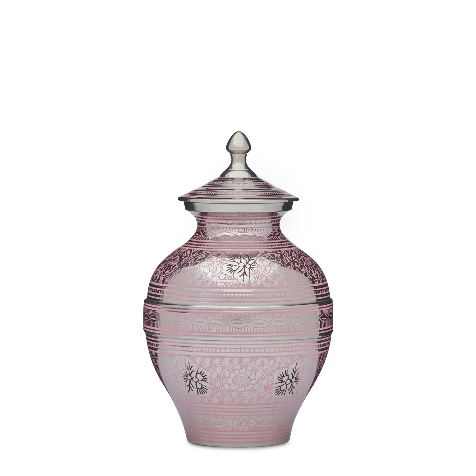 This stunning Pink Butterflies Medium urn is made from solid brass and coated in silver nickel. Etched into the silver nickel coat are black butterflies. An intricate pattern is etched into the background of the urn and filled in a beautiful pink paint. This urn is made from solid brass, requires no maintenance and is very well made.
