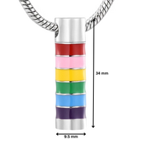 A lovely rainbow cylinder pendant. This colourful pendant is made from stainless steel and finished in a silver tone. An internal cavity enables you to enclose a small amount of your loved one's ashes.