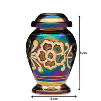 A stunning solid brass keepsake urn. The Roman Green and Gold Keepsake Urn has an exquisite iridescent paint effect. Gold plating is applied in a beautiful floral pattern around the body and lid of the urn.  This cremation urn is made from solid brass, requires no maintenance and is very well made.