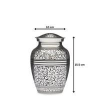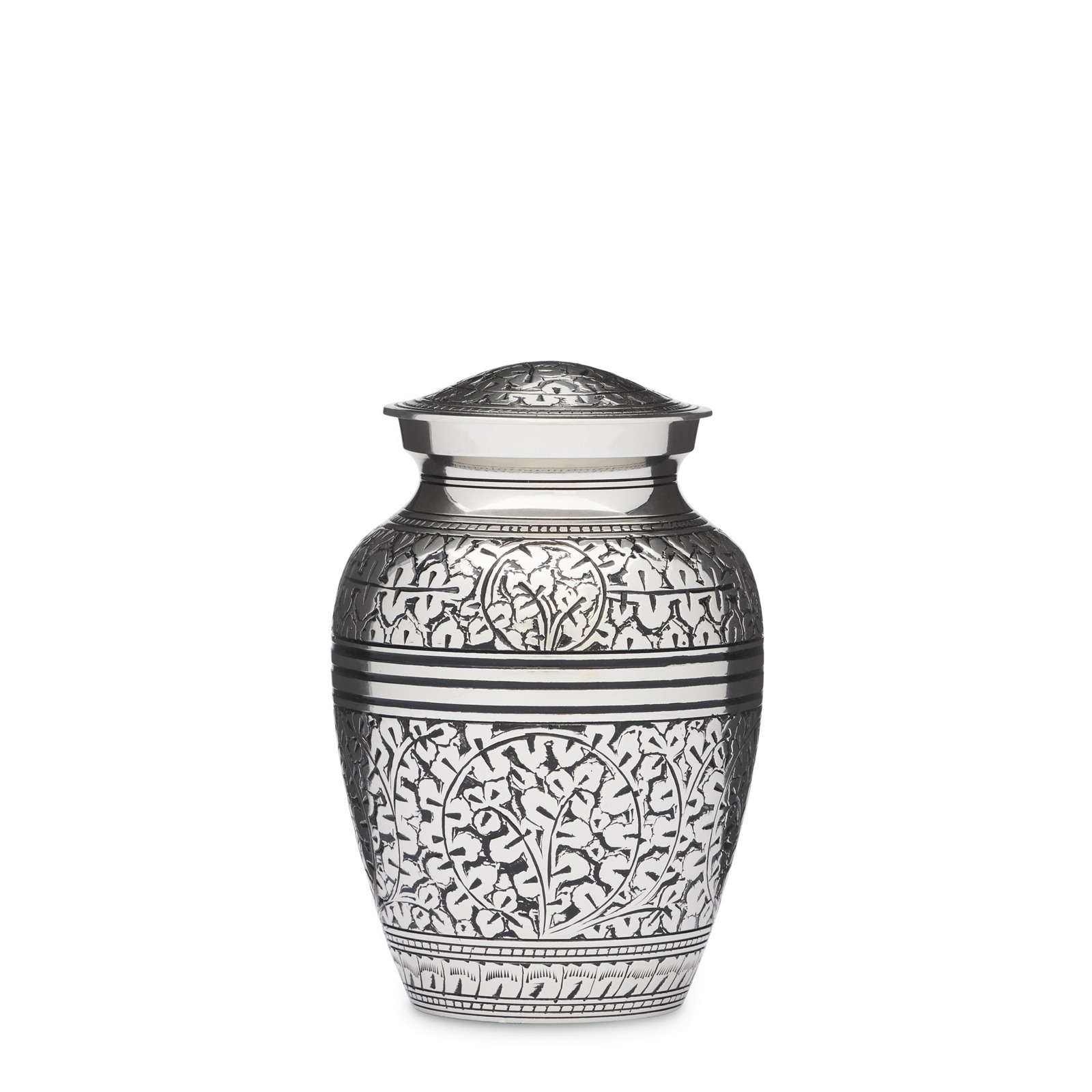 This stunning Silver Acorn Leaf Urn is made from solid brass. Silver nickel is plated over the brass and holds an intricate acorn leaf pattern. This cremation urn is made from solid brass, requires no maintenance, is very well made, and is heavy in weight.