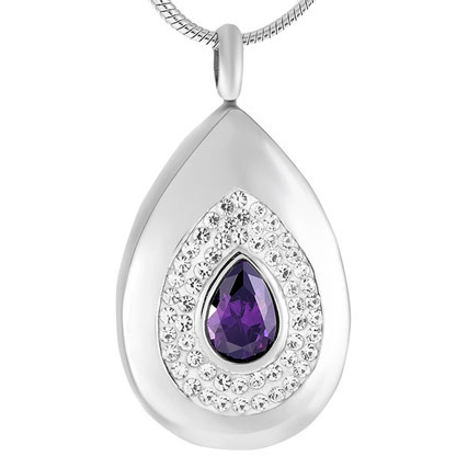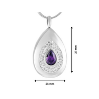 An elegant teardrop pendant with a purple teardrop shaped synthetic gemstone inlaid in the centre. The purple gemstone is bordered by rows of diamantes in the shape of a tardrop. This solid pendant is made from stainless steel and finished in a silver tone. A small recess enables you to enclose a few grains of your loved one's ashes.