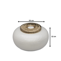 This stunning White and Gold Candle Medium Urn is made from solid brass. The white enamel coating has a natural soft hammer pattern running in circles around the body of the urn. The lid is made from gold nickel, features a beautiful mandala pattern and houses a tealight candle. This cremation urn requires no maintenance, is very well made and is heavy in weight.