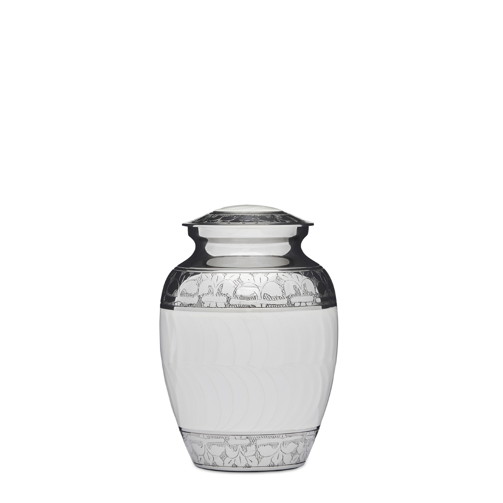 This beautiful white enamel urn has a Fleur de Lis pattern embedded in the silver nickel plating. The white enamel has a natural soft hammer pattern running in circles. This cremation urn is made from solid brass, requires no maintenance, is very well made, and is heavy in weight.
