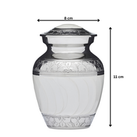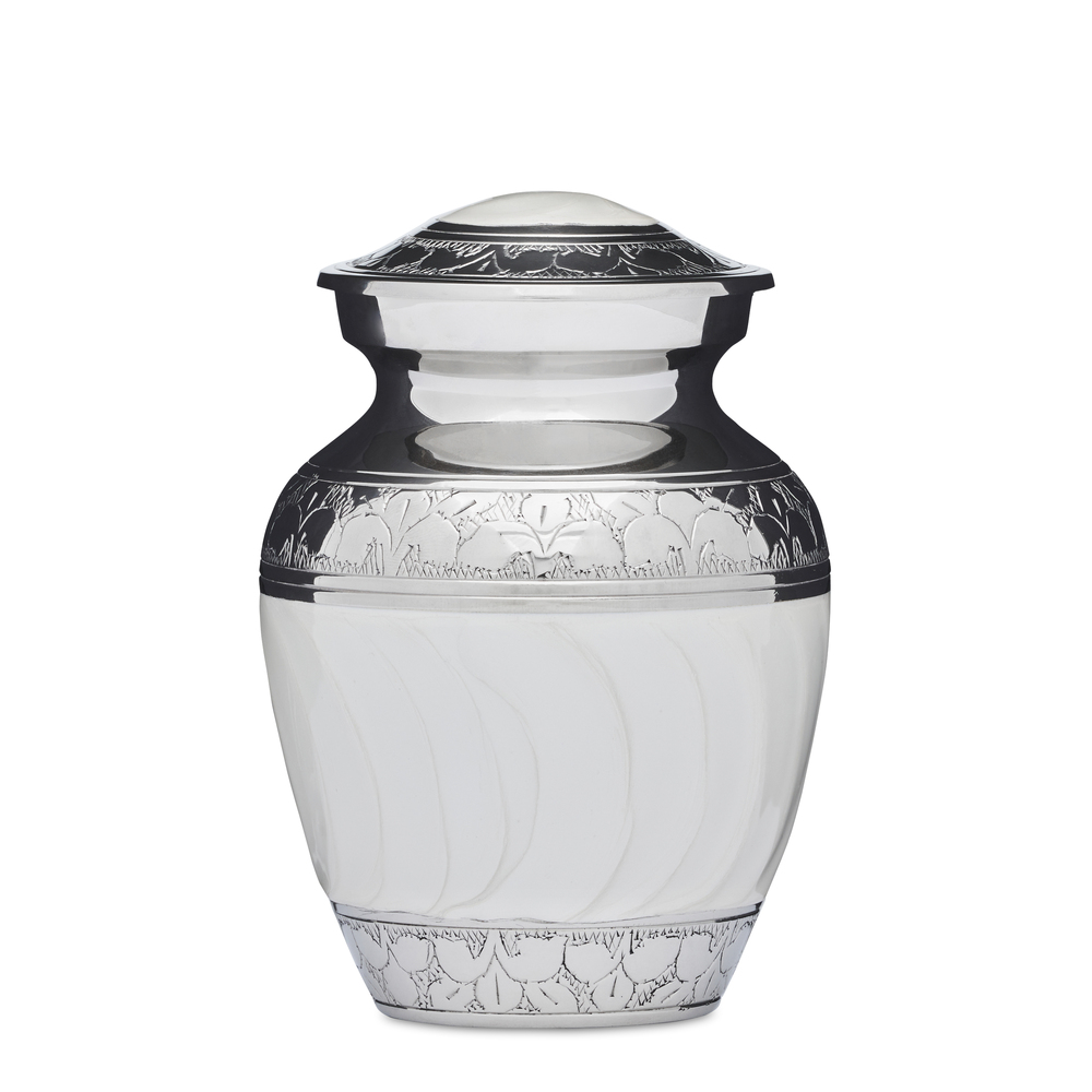 This beautiful white enamel urn has a Fleur de Lis pattern embedded in the silver nickel plating. The white enamel has a natural soft hammer pattern running in circles. This cremation urn is made from solid brass, requires no maintenance, is very well made and is heavy in weight.