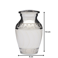 This beautiful White Enamel Keepsake is perfect for keeping a small momento of your loved one - such as soil or sand from a special location, a lock of hair, dried flower petals, a special note or a portion of cremation ashes. This elegant keepsake is made from solid brass, with a white enamel coat. The enamel has a natural soft hammer pattern. The silver nickel plated bands are embedded with a Fleur de Lis pattern. This keepsake fits nicely into the palm of your hand, is very well made and requires no maintenance.