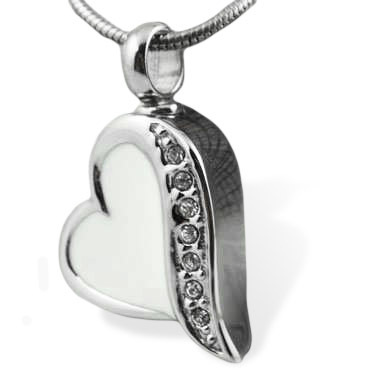 A lovely stylized heart pendant with a white enamel centre. The side of the heart is inlaid with diamantes. This solid pendant is made from stainless steel and finished in a silver tone. A small recess enables you to enclose a few grains of your loved one's ashes.