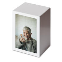 This stylish White Photo Urn is a beautiful and affordable way to honour your loved one. With a soft matte white satin finish, it features a front panel to hold a 5.5" x 10" photo, offering a meaningful and personal tribute. The urn is designed to hold a standard temporary ash box.